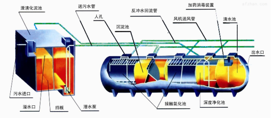 二级生物接触氧化处理工艺均采用推流式生物接触,其处理效果优于完全混合式或二级串联完全混合式生物接触氧化池。并比活性污泥池体积小,对水质的适应性强,耐冲击负荷性能好,出水水质稳定,不会产生污泥膨胀。池中采用新型弹性立体填料,比表面积大,微生物易挂膜、脱膜,在同样有机物负荷条件下,对有机物去除效率高,能提高空气中的氧在水中的溶解度。